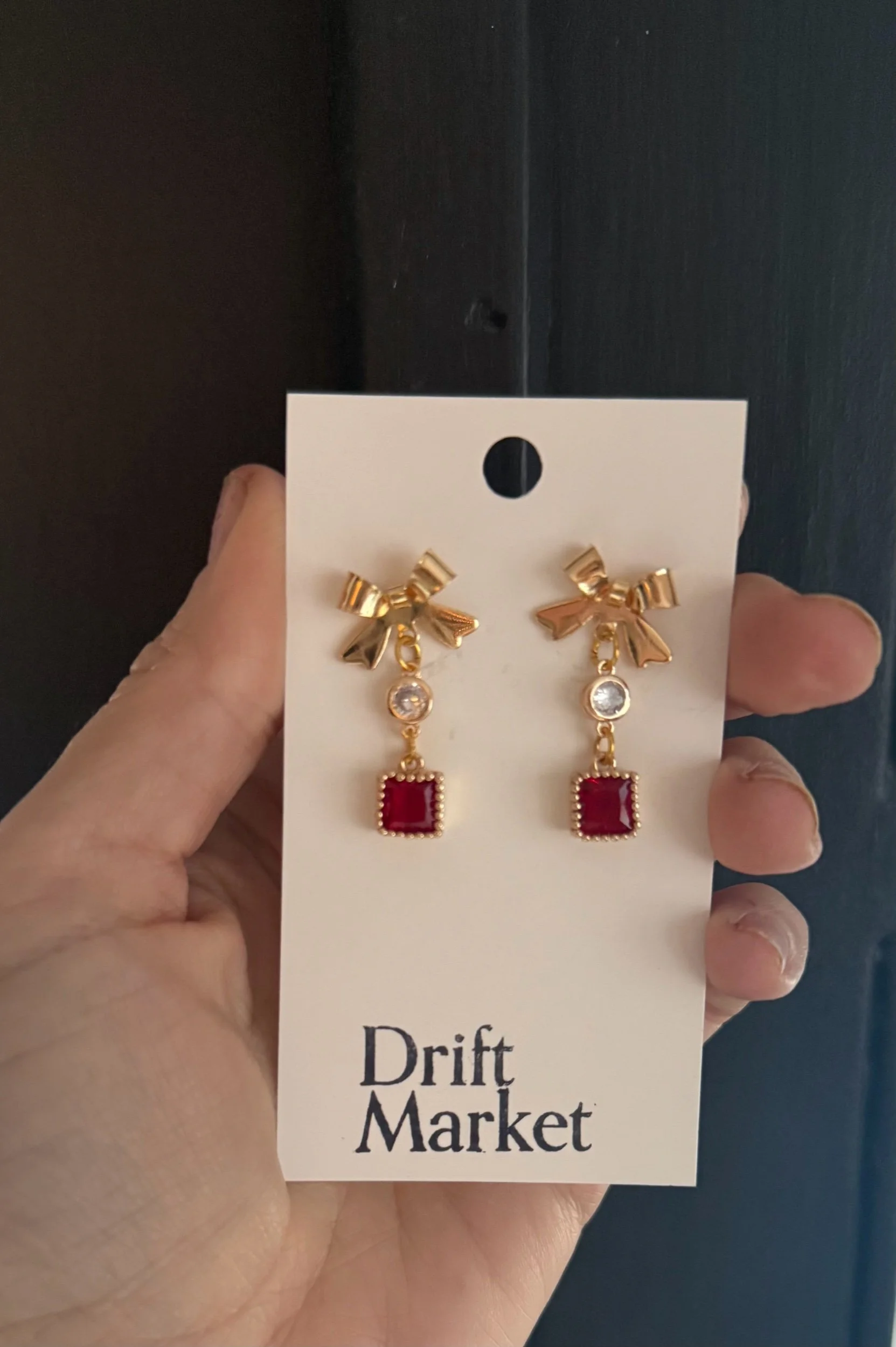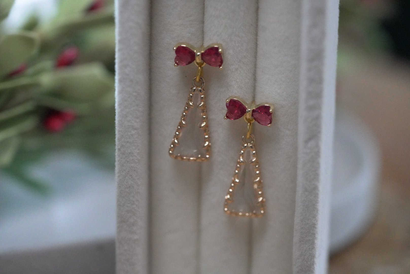 Festive, flirty, and wrapped like the perfect little present. These bow-topped ruby drops add a sweet pop of red to any holiday outfit. These are 1 inch in length. Gold vermeil now stud.