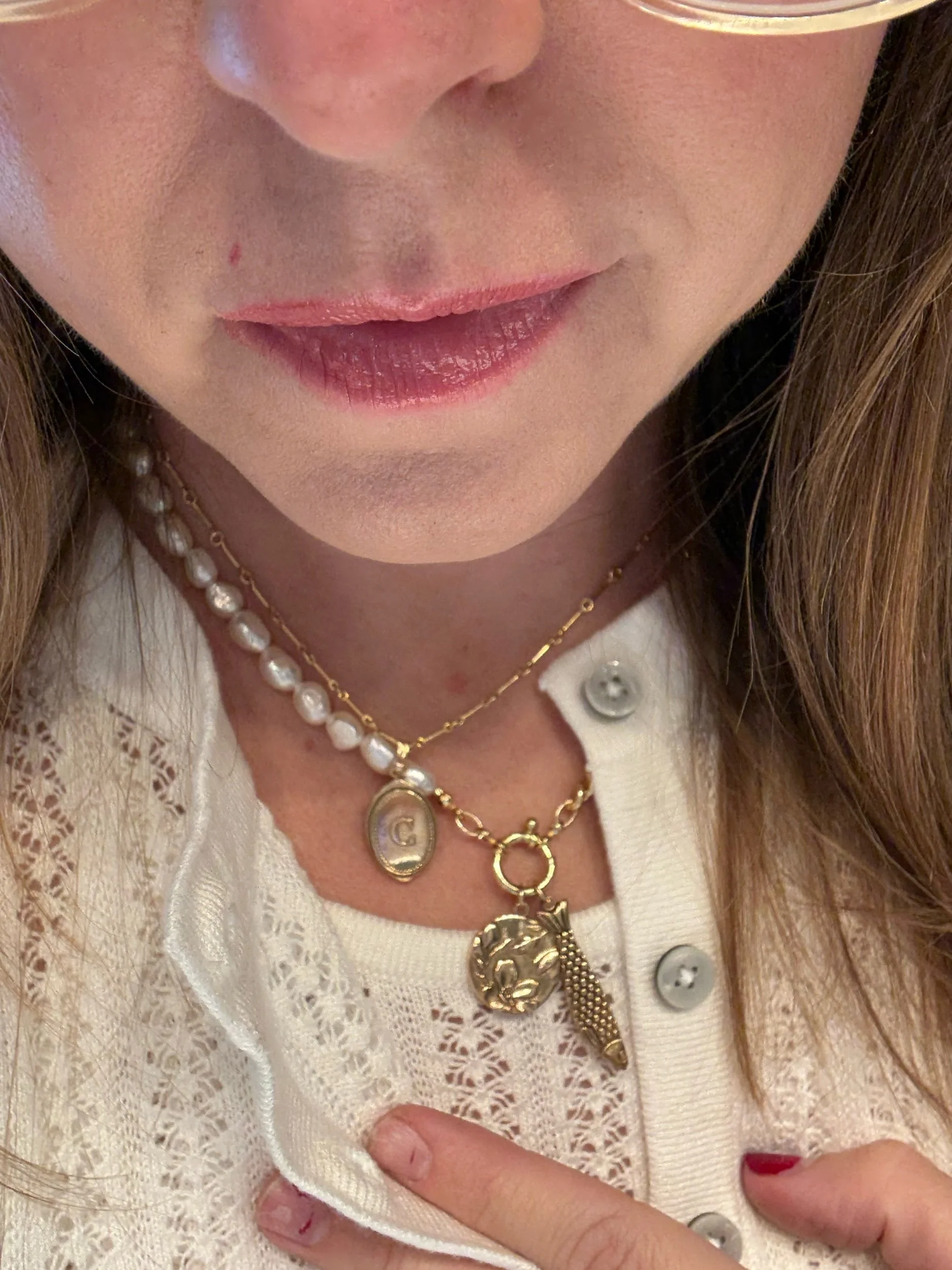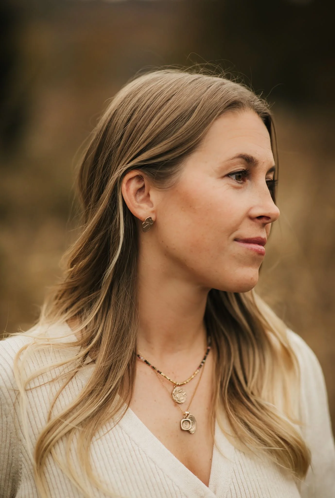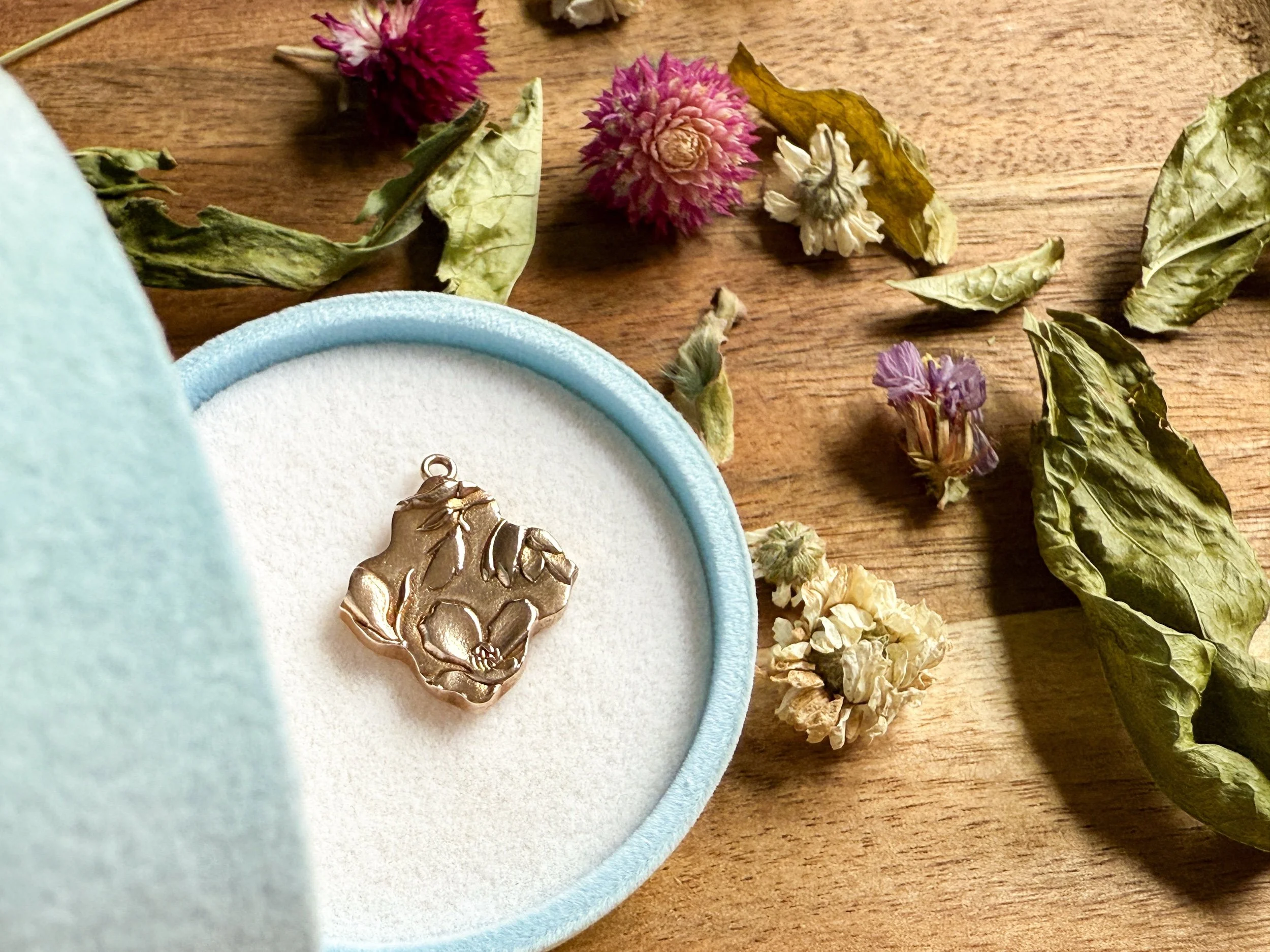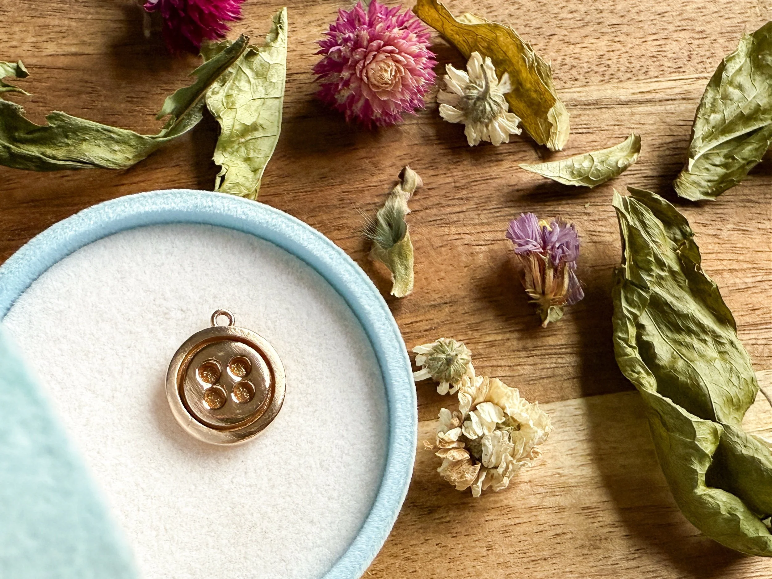 My Grandma used to collect buttons, and I remember spending hours and hours as a little girl going through her collection. I loved all the different shapes and sizes. A button to me symbolizes connection. A button fastens two pieces of fabric together- which can represent bringing separate things together to from a whole. I made this charm as an ode to my grandma, and i adore it.