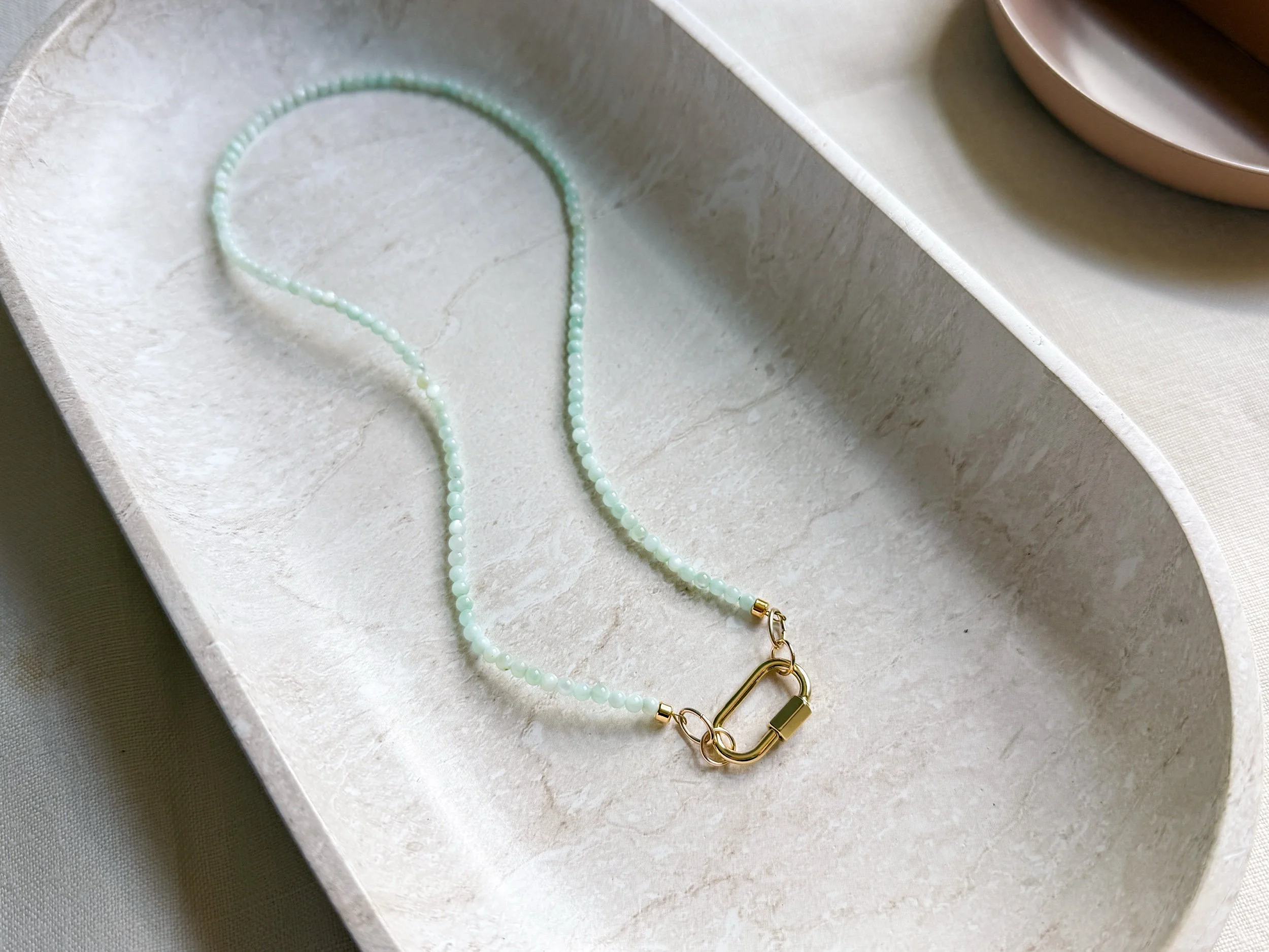 Green Jade beaded gemstone necklace. This reminded me of something i saw in my grandmas Jewlery box not long ago. It has such a vintage and timeless feel to it. Green jade beads and a gold filled chain with gold filled beads in between the gems. 18.5 inches. I tried out a new component on this guy, where you can pull a tab from the back to lengthen or shorten it- so you can wear this gal any length you’re heart desires!