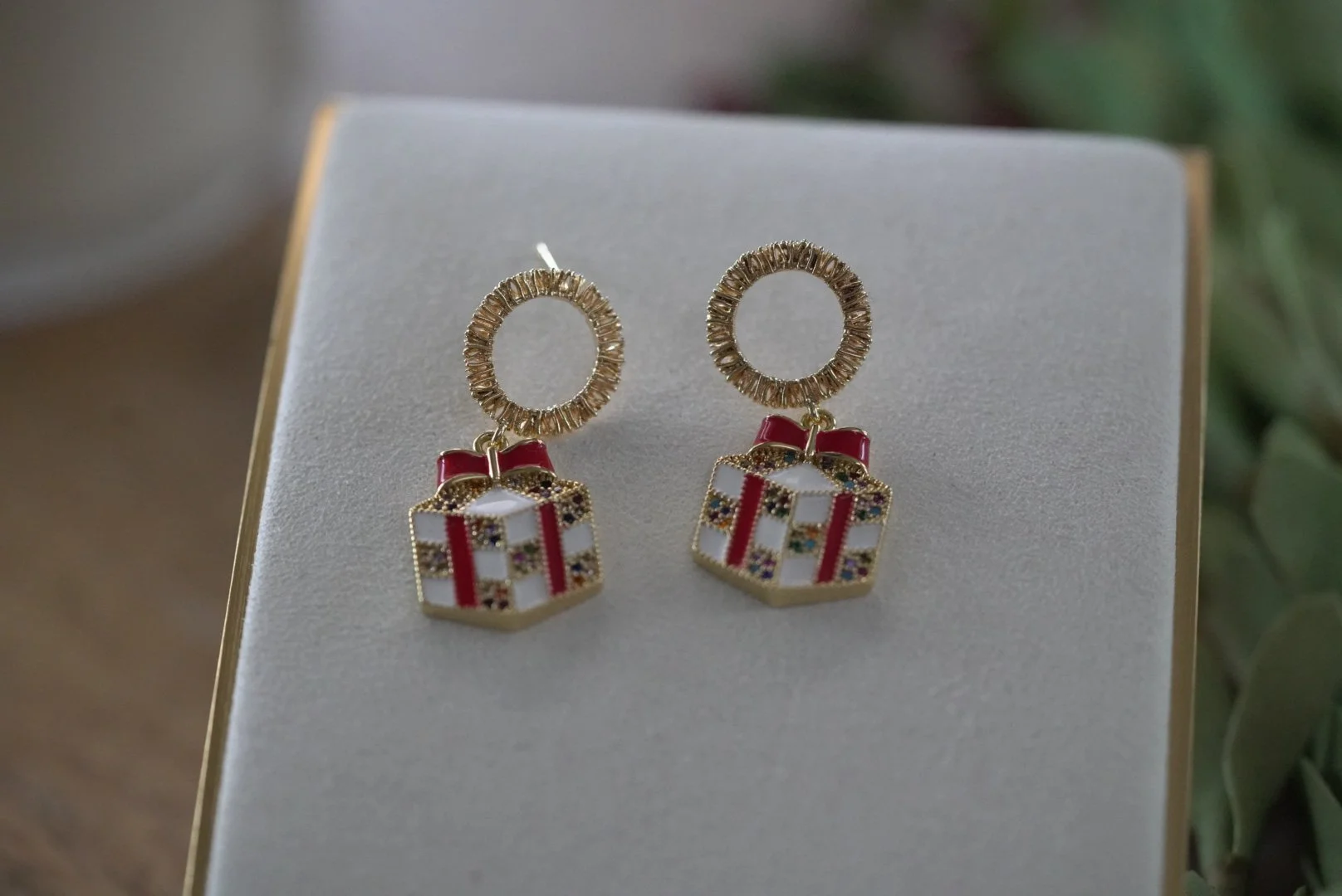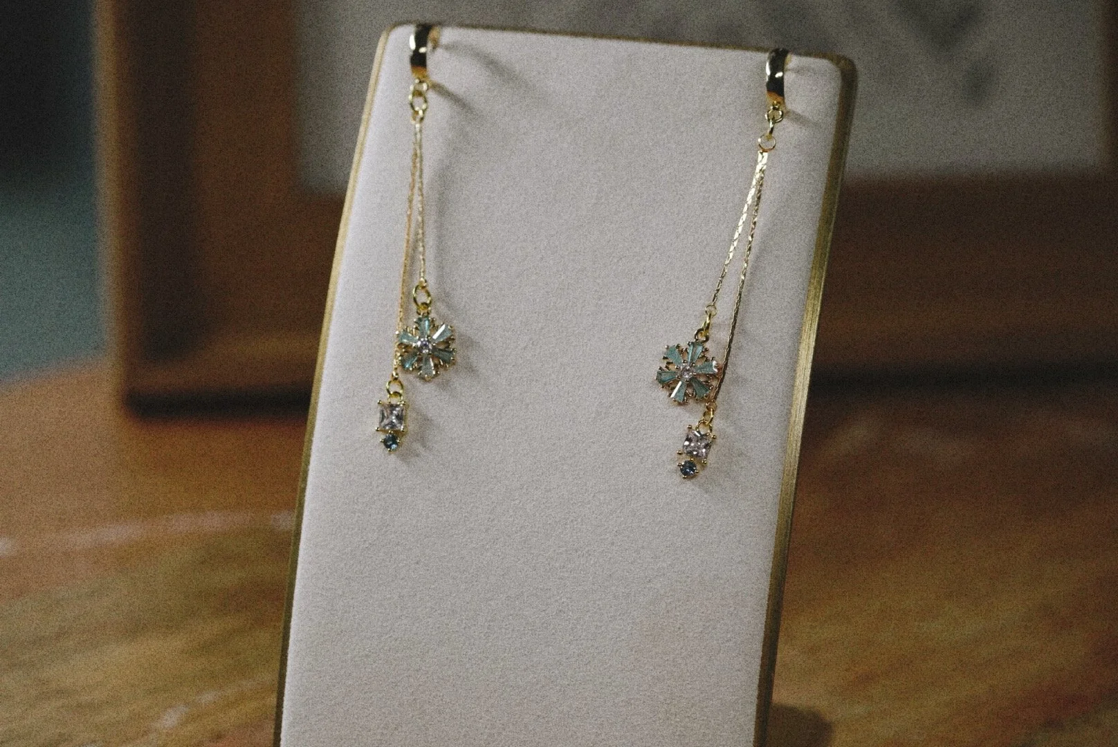 These earrings bring a soft winter sparkle with deep blue bow studs and delicate snowflake charms. These are an inch in length.