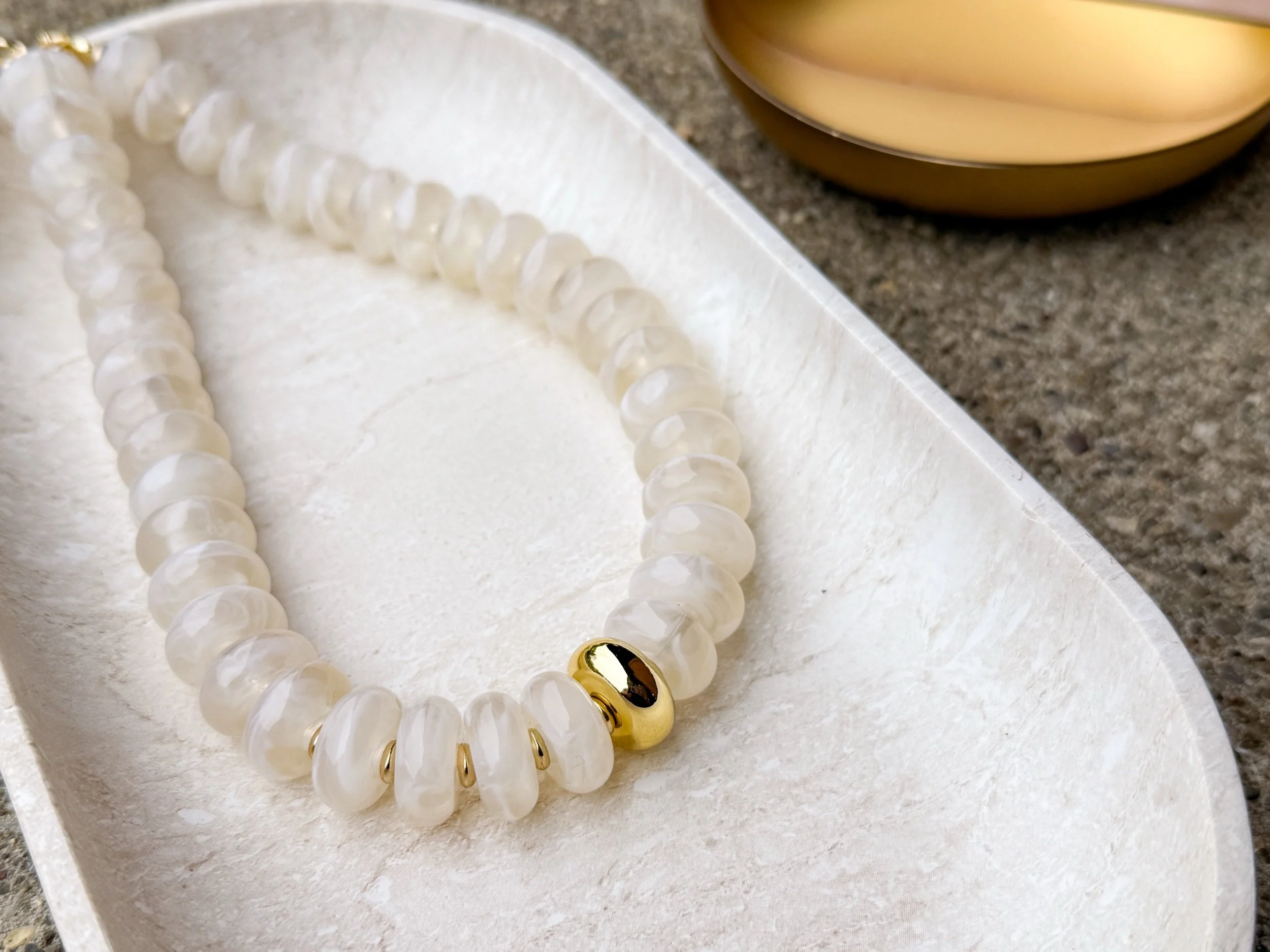 Fav necklace of the entire drop. She has my heart. Chunky resin beads (not real gemstones). She is 18inches in length with a 2 inch extension. Chunky beads 8X17mm. Can be made without the gold bead in the center if you would like! Water resistant. The creamiest color of cream beads!