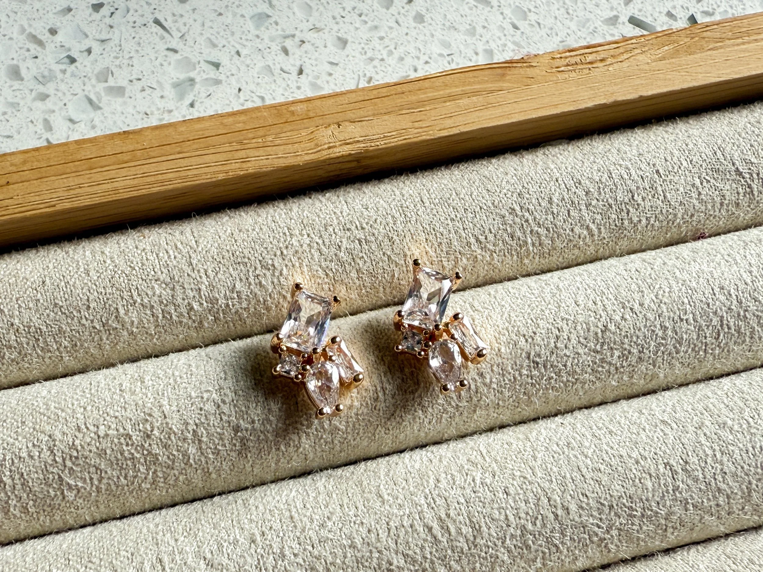 Meet your new go-to sparkle studs. Probably my favorite of the drop. These little studs keep things simple but still bring that soft, pretty shine. With a mix of baguette and round crystals set in warm gold, they catch the light perfectly. Easy to toss on with anything, comfy enough for all-day wear, and cute enough to make you feel a little more put together, even on your most relaxed days. These guys are half an inch in length.