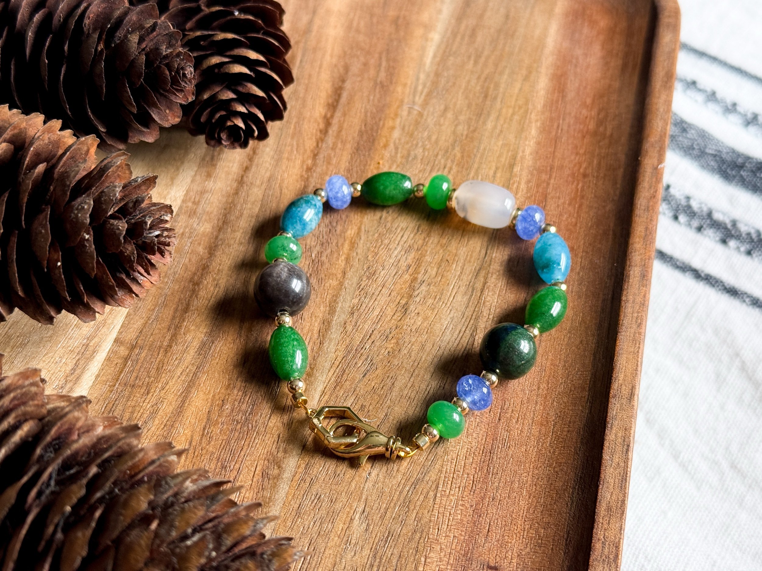 This beaded bracelet is made out of semi- precious stones, including jade and fluorite. It has a gold filled lobster clasp. There is a necklace to match these in the drop as well! (evergreen sky)