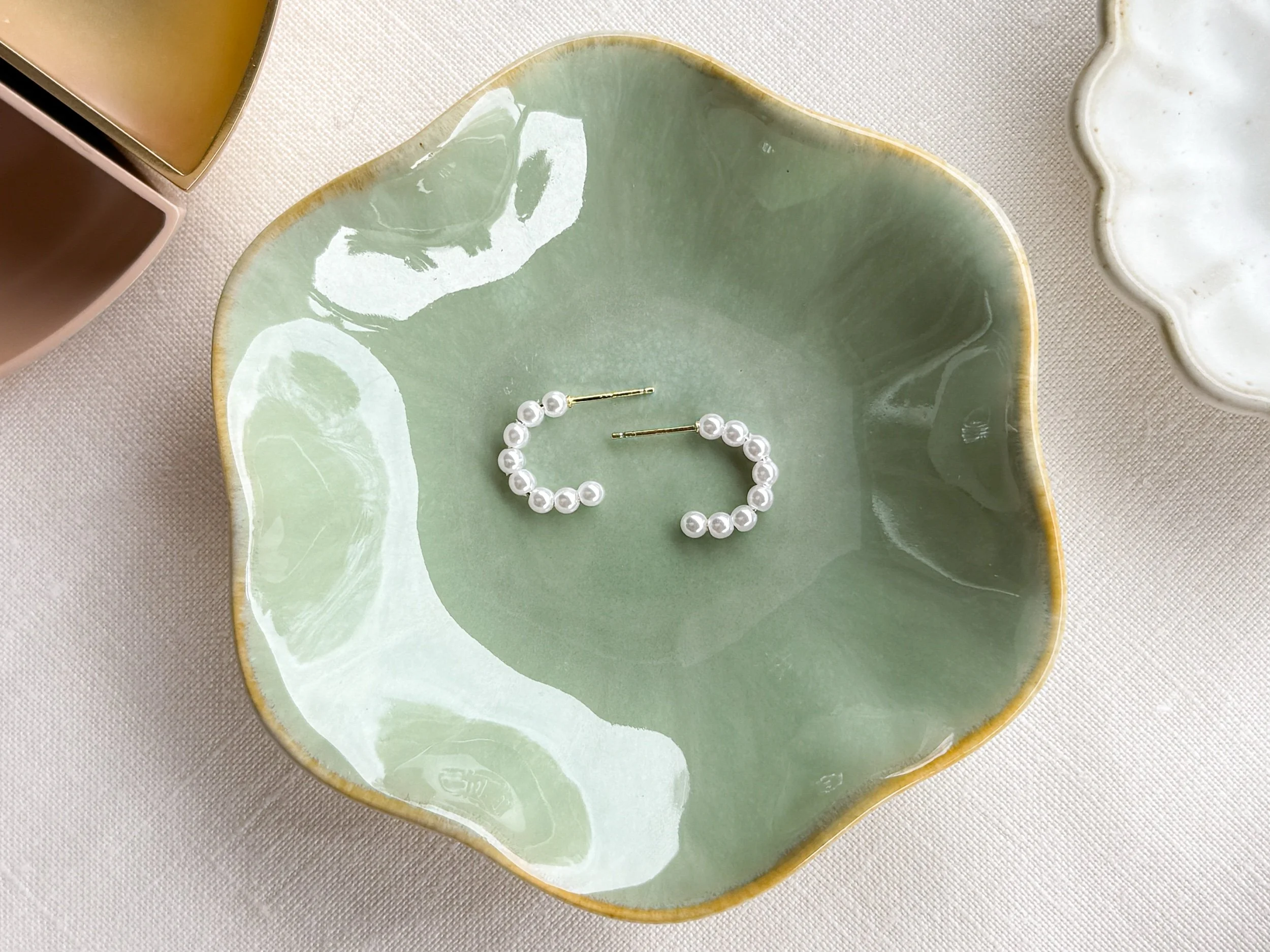 Little baby handmade pearl earrings. These are 3/4 of an inch in diameter. These cuties are quiet and refined and yet have a very lived in look to them. I love how simple they are and how they can dress any outfit up or down. Super classy.