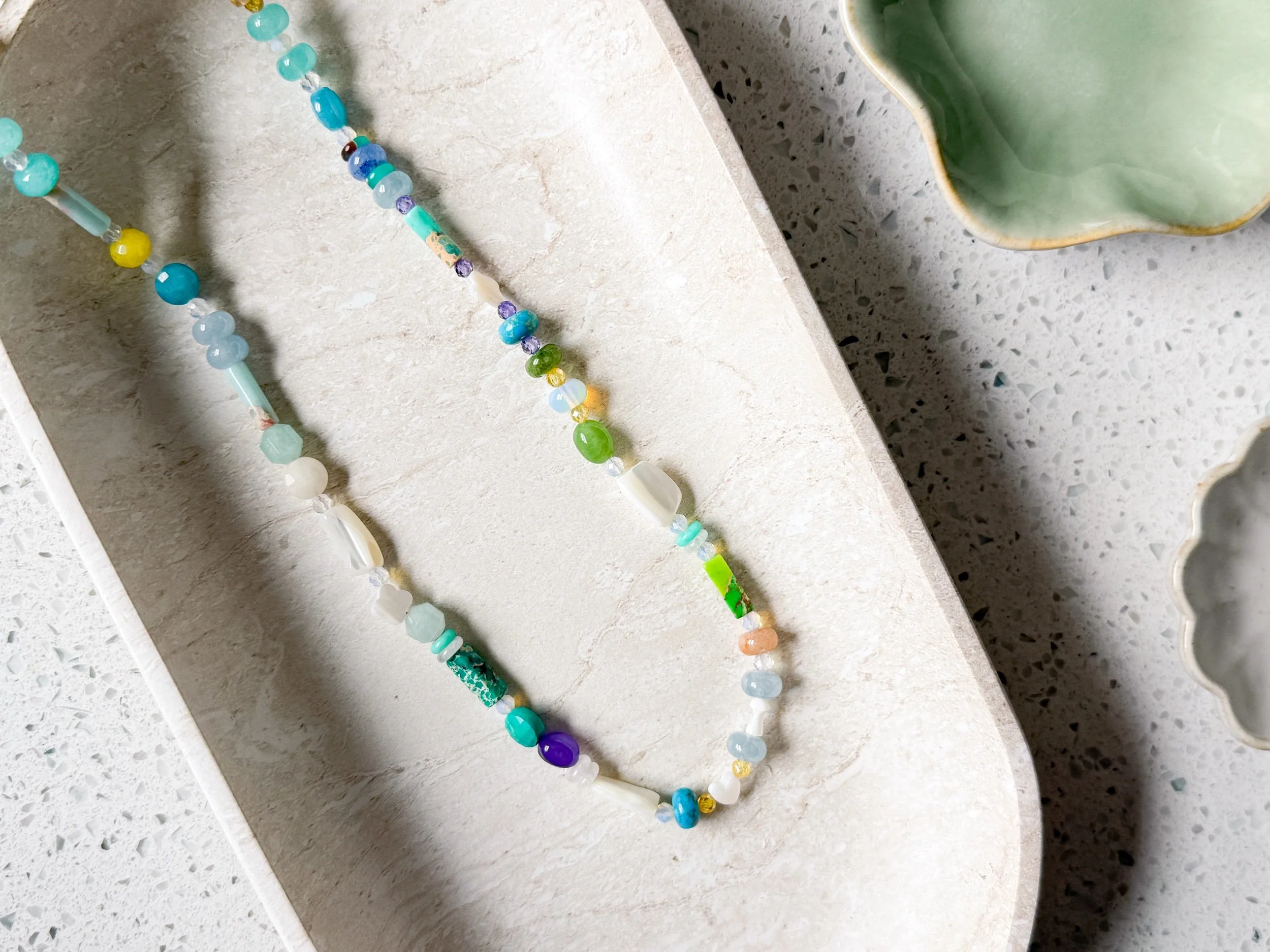 Rainbow beaded necklace with such fun & different beads. 18 inches in length with a 2 inch extension . Can remove the extention and add in a connector of your choice. Just purchase the connector separately . Gold filled findings.