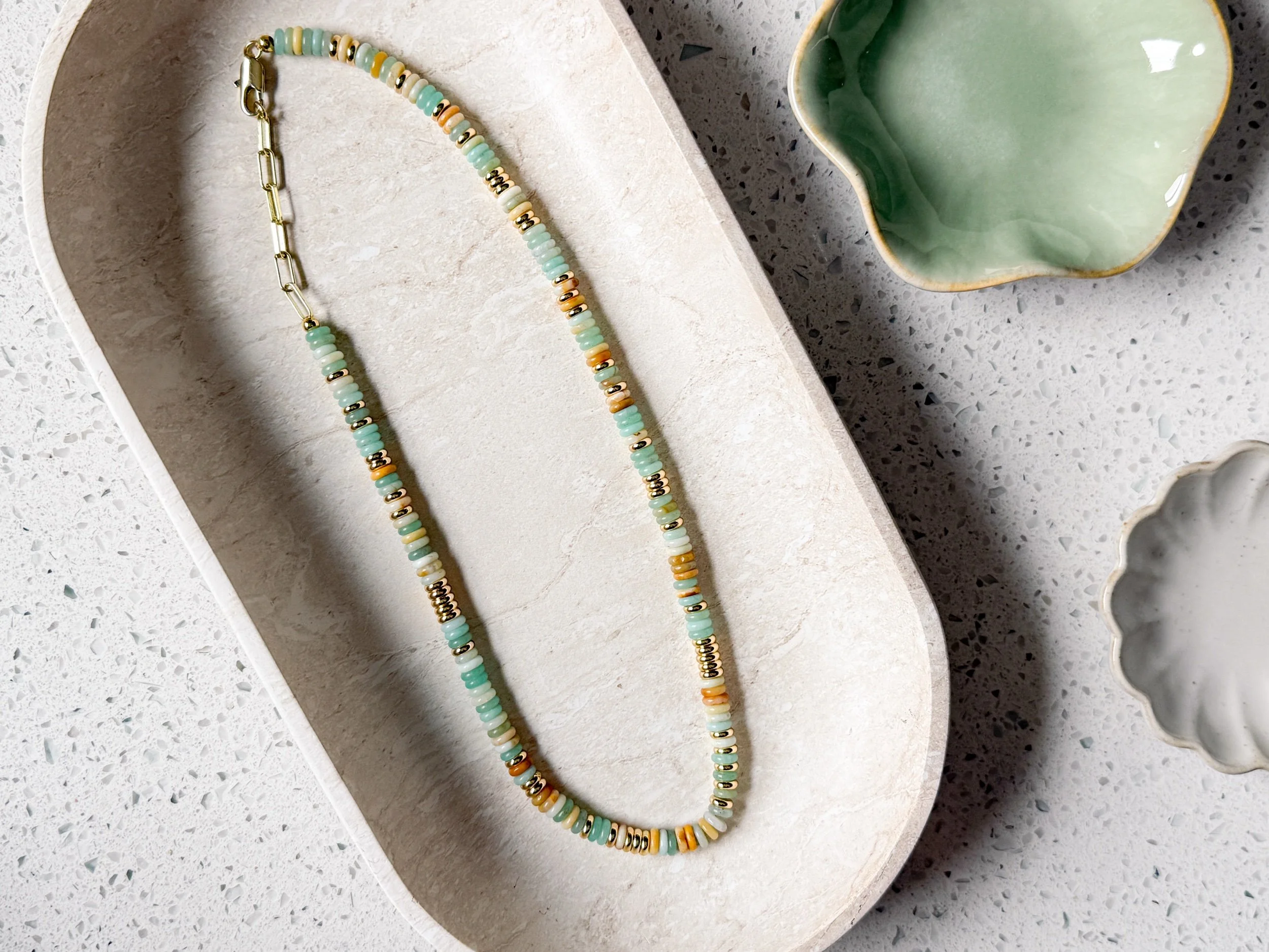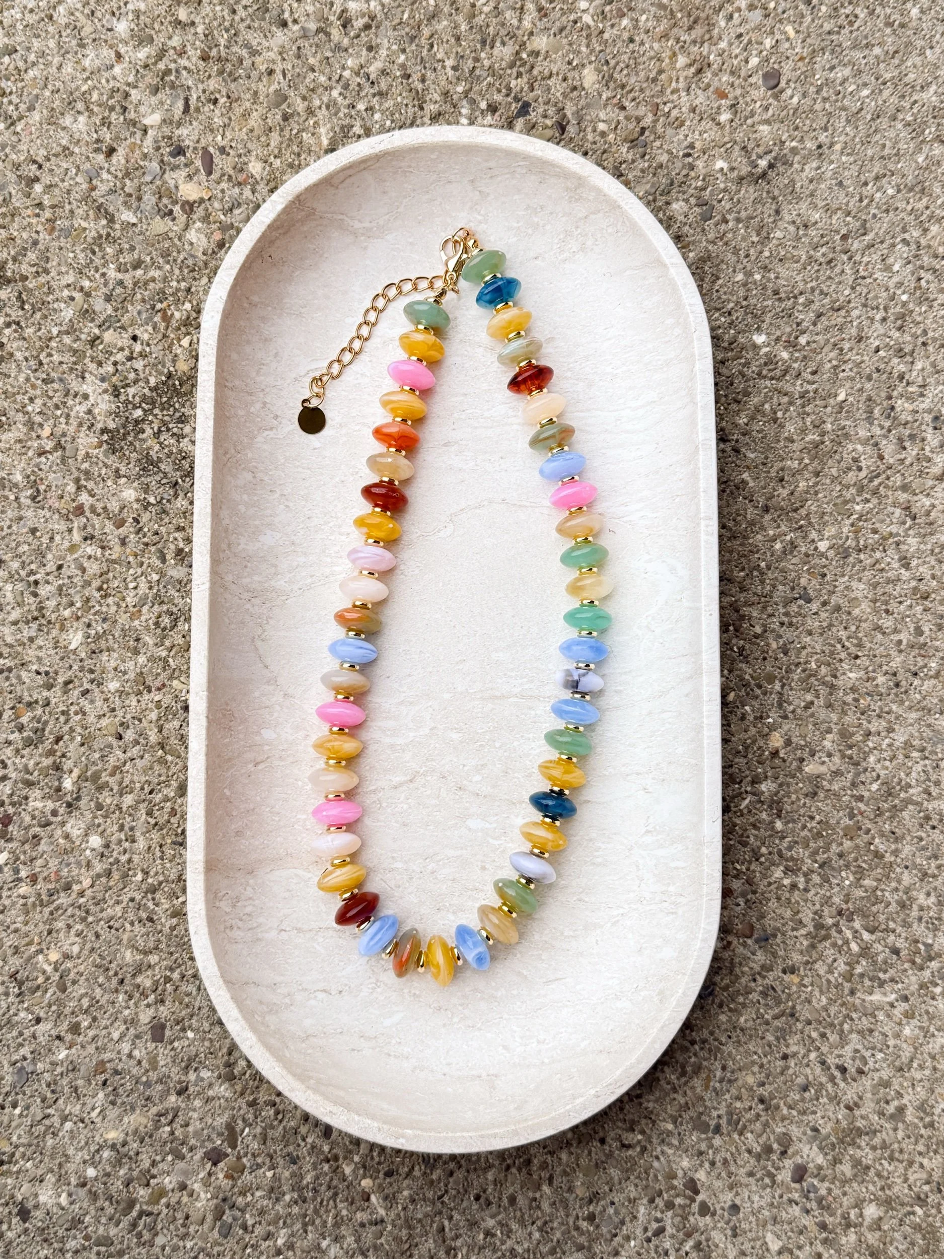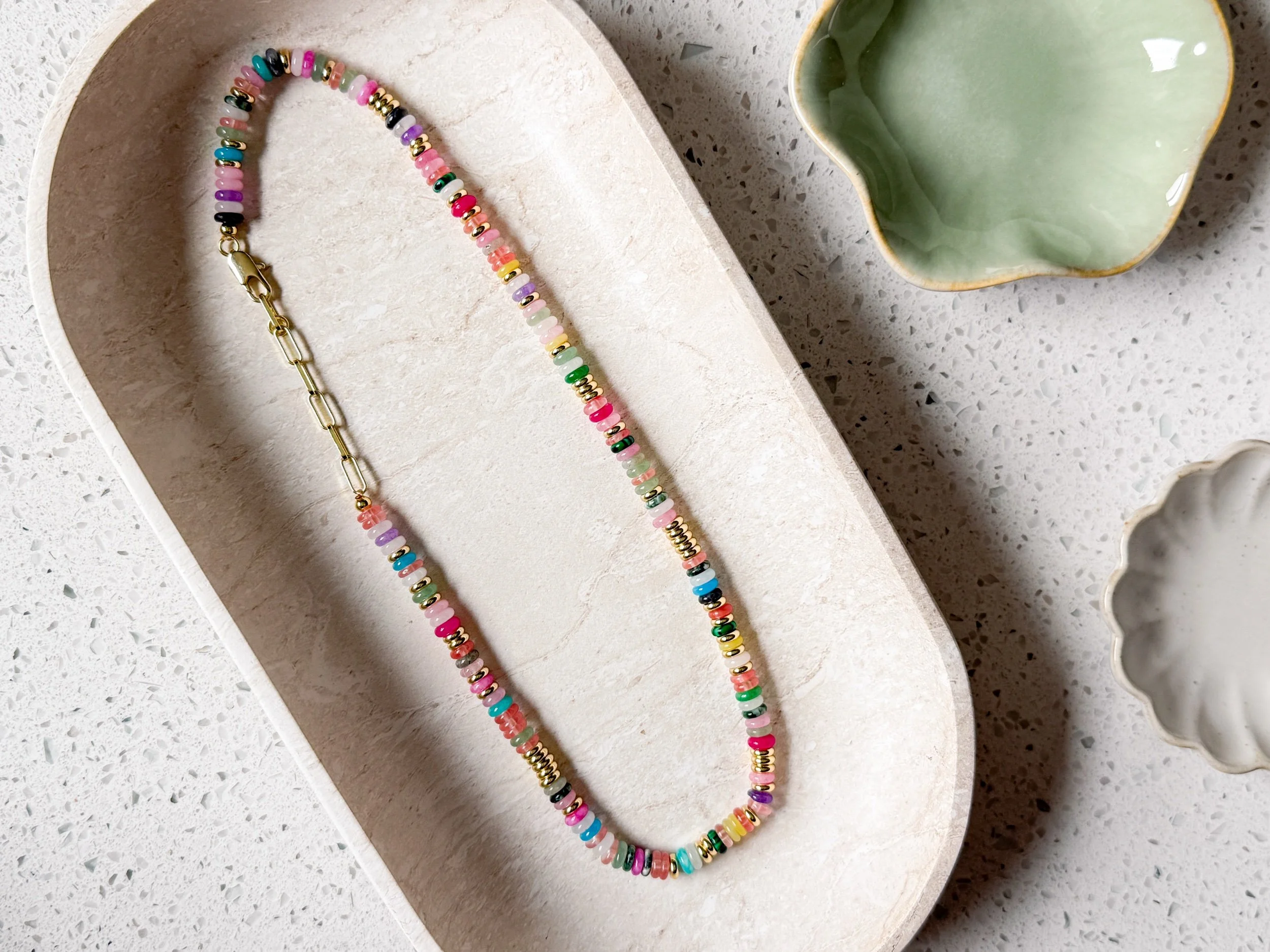 This is made from resin beads and not real gemstones- hence the price point. This is perfect for wear as the beads will stay glossy and not scratch! How fun is this for summer? 17 inches in length. 2 inch extension. Chunky gal!! Beads are 12X5mm. Water resistant.