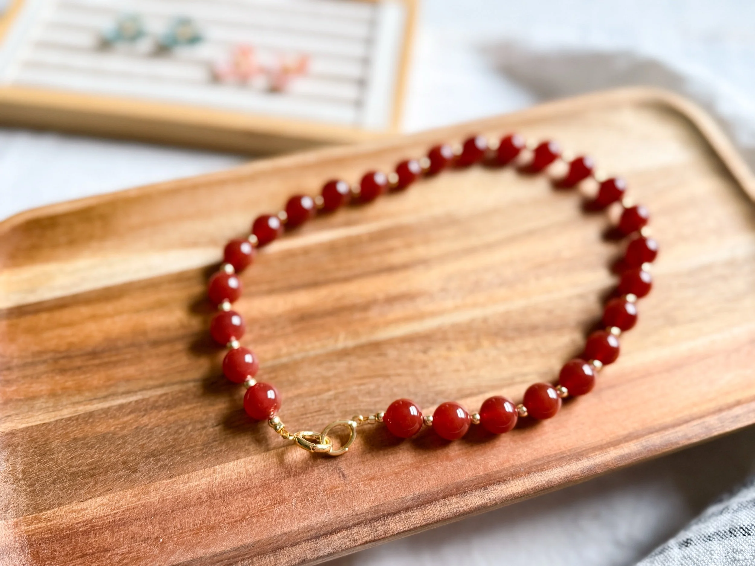 Bold, warm, and full of holiday energy. This necklace is made with rich red-amber beads that glow with marbled swirls. Chunky gal!! 8mm beads- she’s the biggest necklace in the drop. 17 inches in length. These are the only plastic beads I offer in this drop- so they are not real!